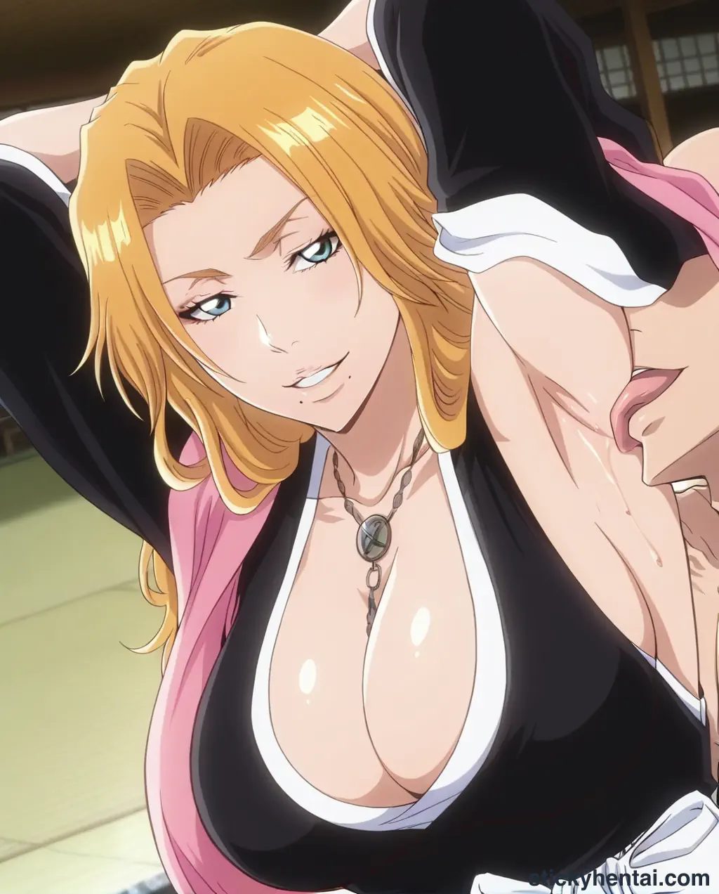 See the complete collection of images featuring Orihime Inoue spitroast position with two men (Deepthroat and vaginal)